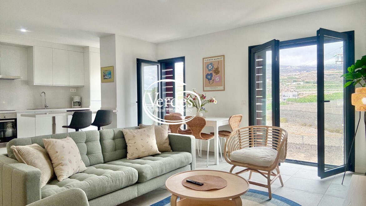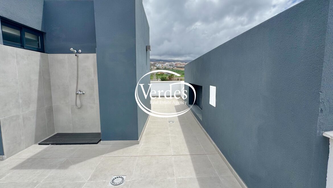 Eine schöne Holztreppe führt in die zweite Etage, wo Sie einen großen Außenbereich mit Blick auf den majestätischen Teide und das Meer genießen und das Solarium betreten können, wo Sie sich in den Hängematten entspannen und sich unter freiem Himmel in der wunderbaren Dusche abkühlen können.