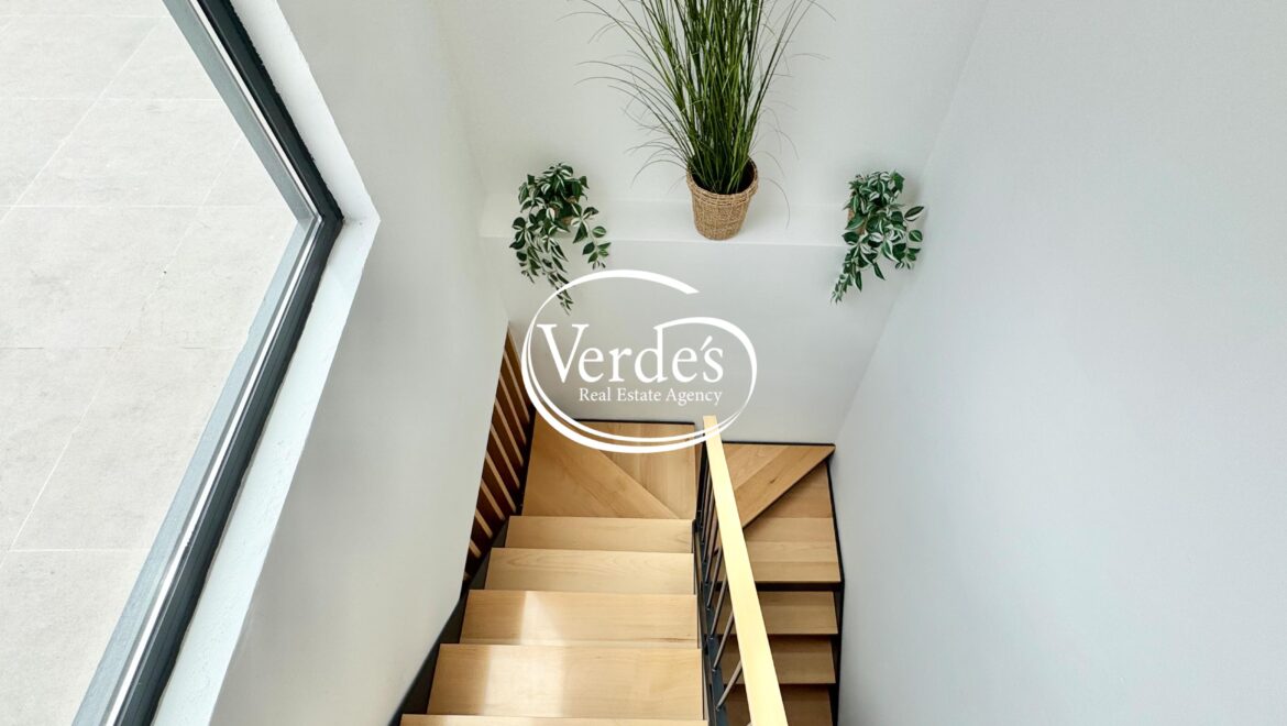 Im ersten Stock befindet sich ein gemütliches Esszimmer, umgeben von großen Fenstern, und eine Küche mit Frühstückstheke. Zwei Schlafzimmer vervollständigen diesen ersten Eindruck der Immobilie.