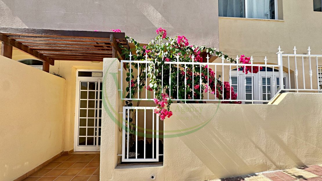 El patio frontal, accesible desde el salón, permite disfrutar de un espacio al aire libre, mientras que la cocina conecta con una amplia terraza, perfecta para relajarse. Además, el acceso desde el dormitorio principal a la terraza añade un toque de conveniencia.